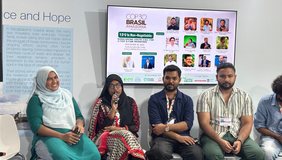 The session, held at 12:30 PM (Brazil Time), brought together youth leaders, climate experts, academics, government officials, and civil society representatives to reflect on the escalating climate crisis and the disproportionate impacts on vulnerable communities in Bangladesh.